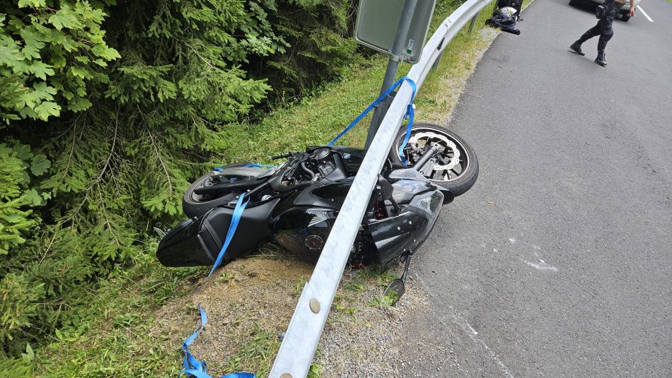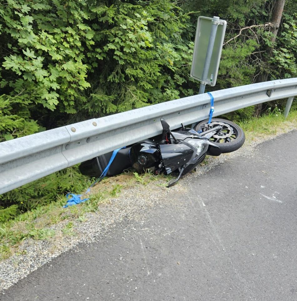 Am Samstag, dem 16.8.2025 gegen 12Uhr30 stürzte ein Motorradfahrer auf der Schöcklstraße vom Schöcklkreuz kommend in einer Kurve aus. Das Motorrad rutschte zum Teil unter einer Leitplanke durch, der Fahrer blieb zum Glück unverletzt.