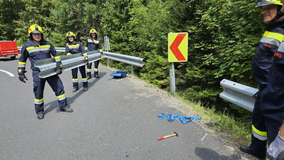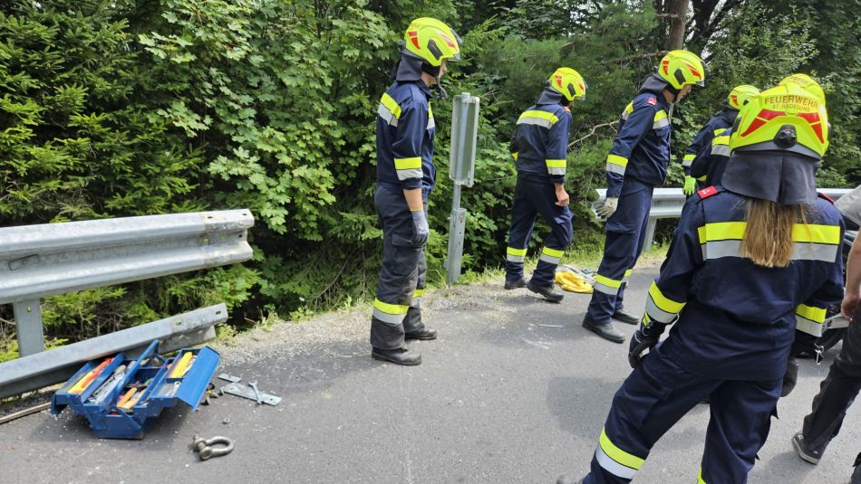 Da das Motorrad unter der Leitplanke verkeilt war, montierten die Feuerwehrleute der FF St.Radegund ein Stück der Leitplanke ab, um das Motorrad zu bergen.