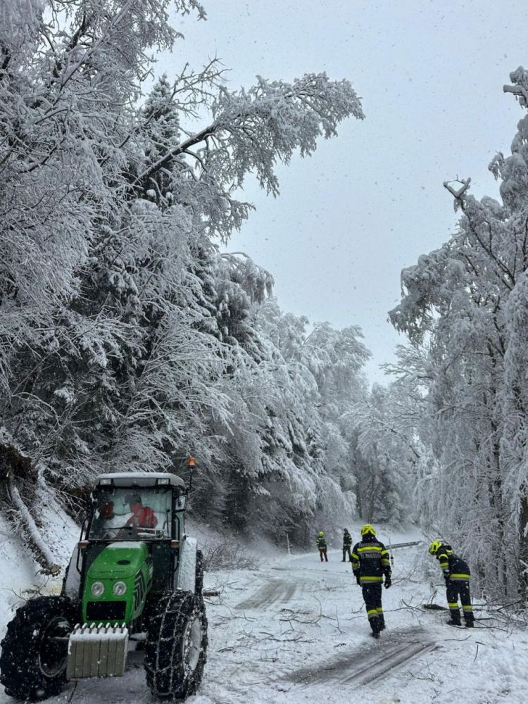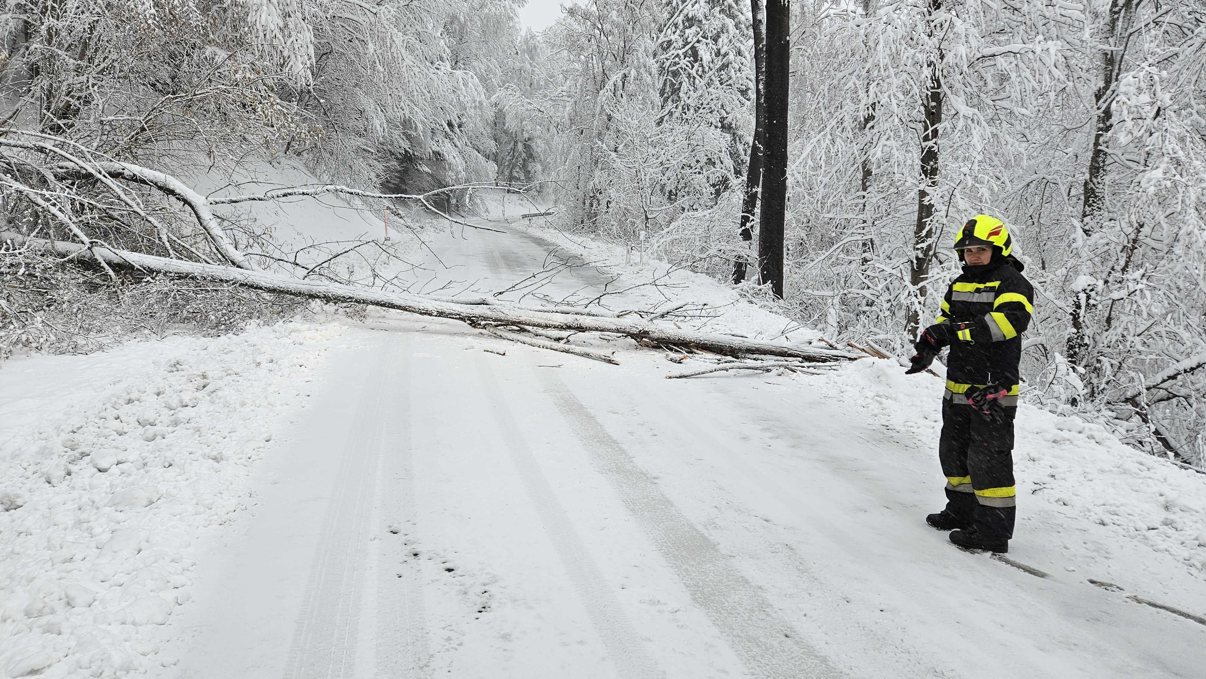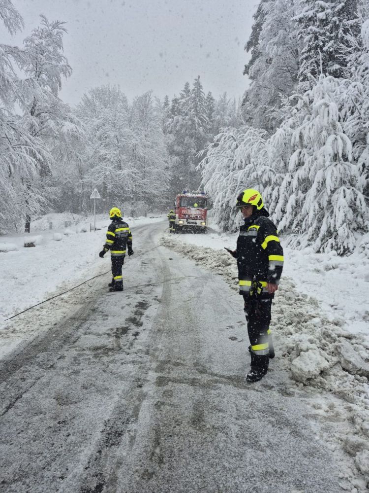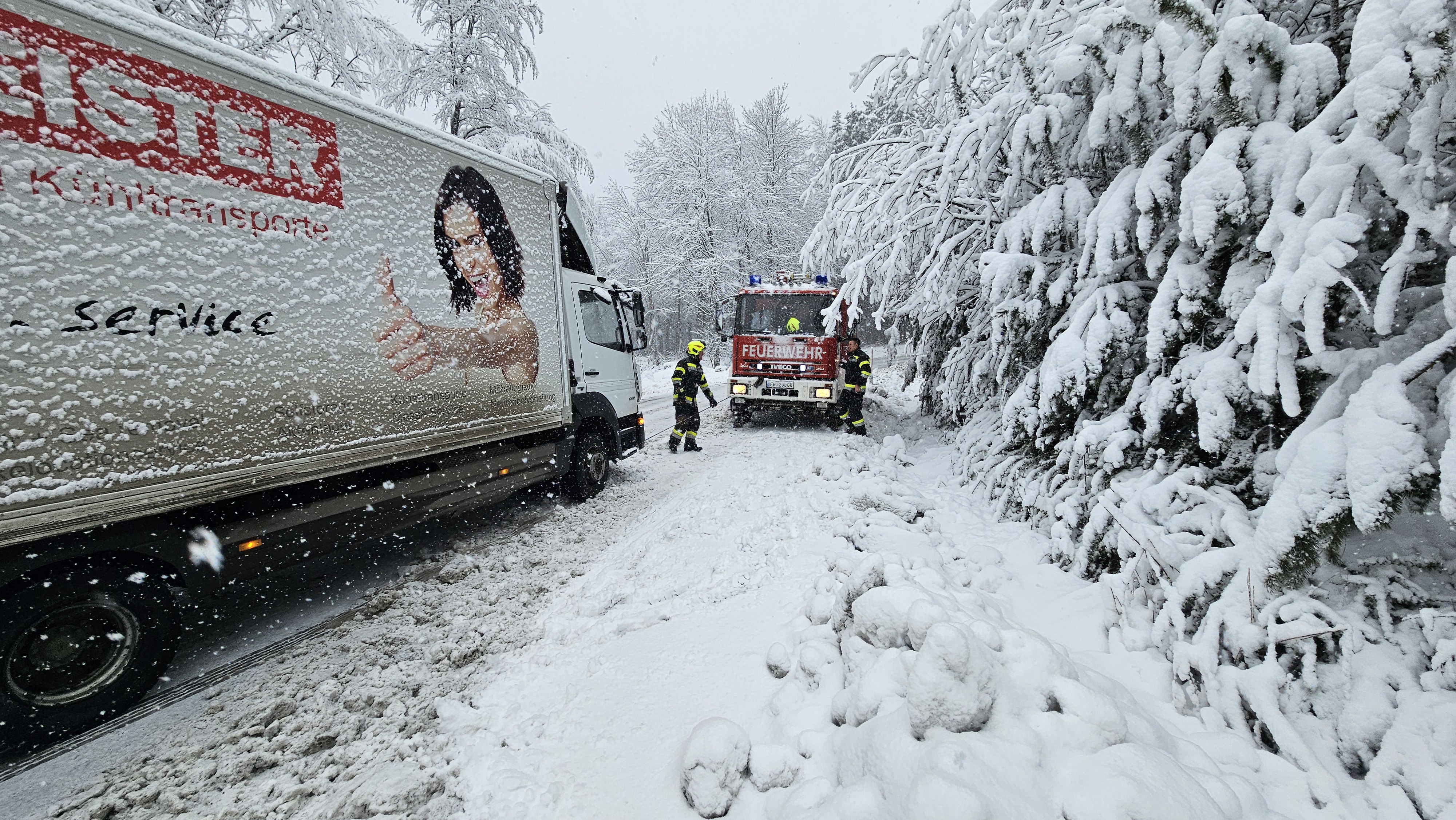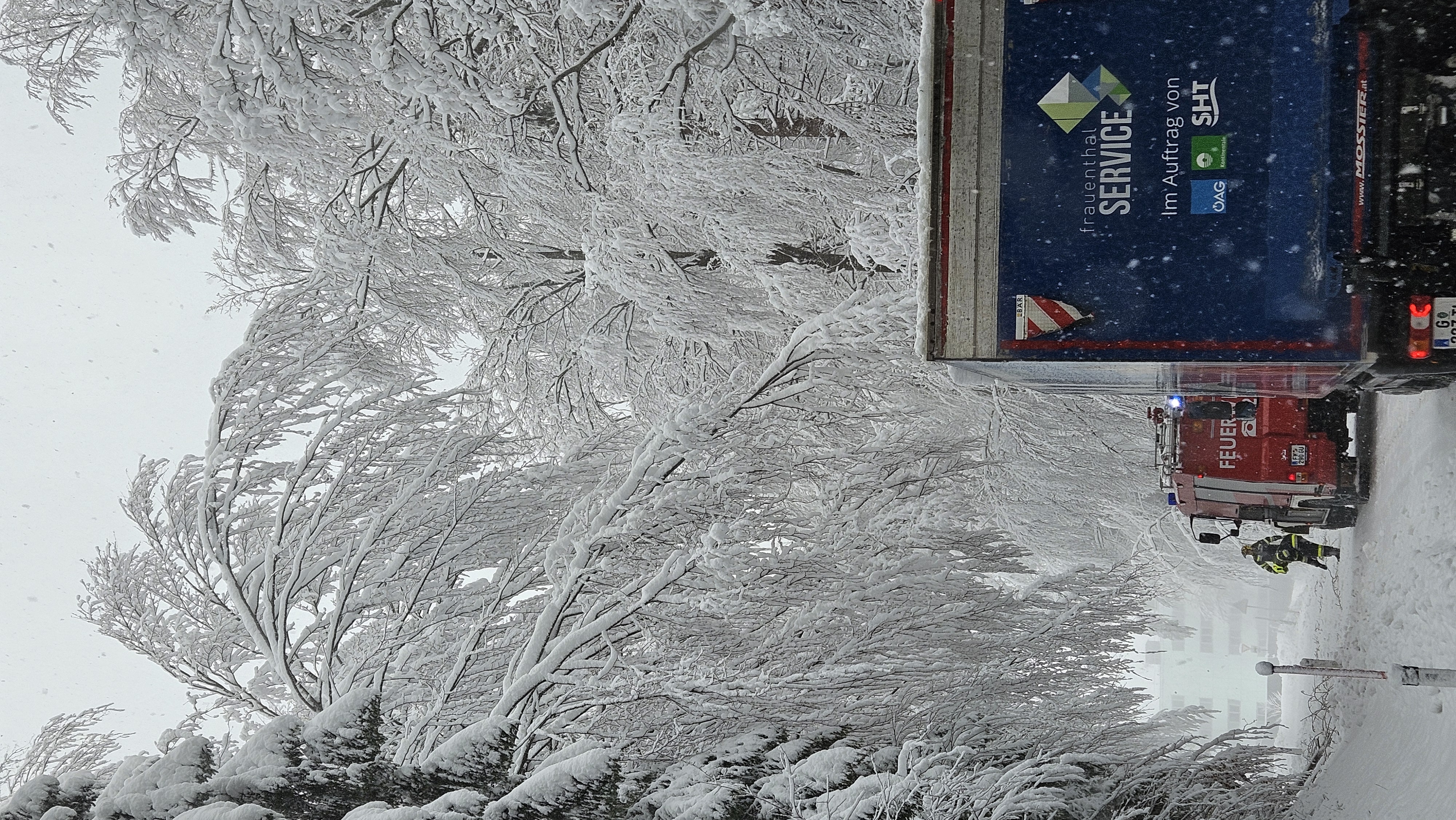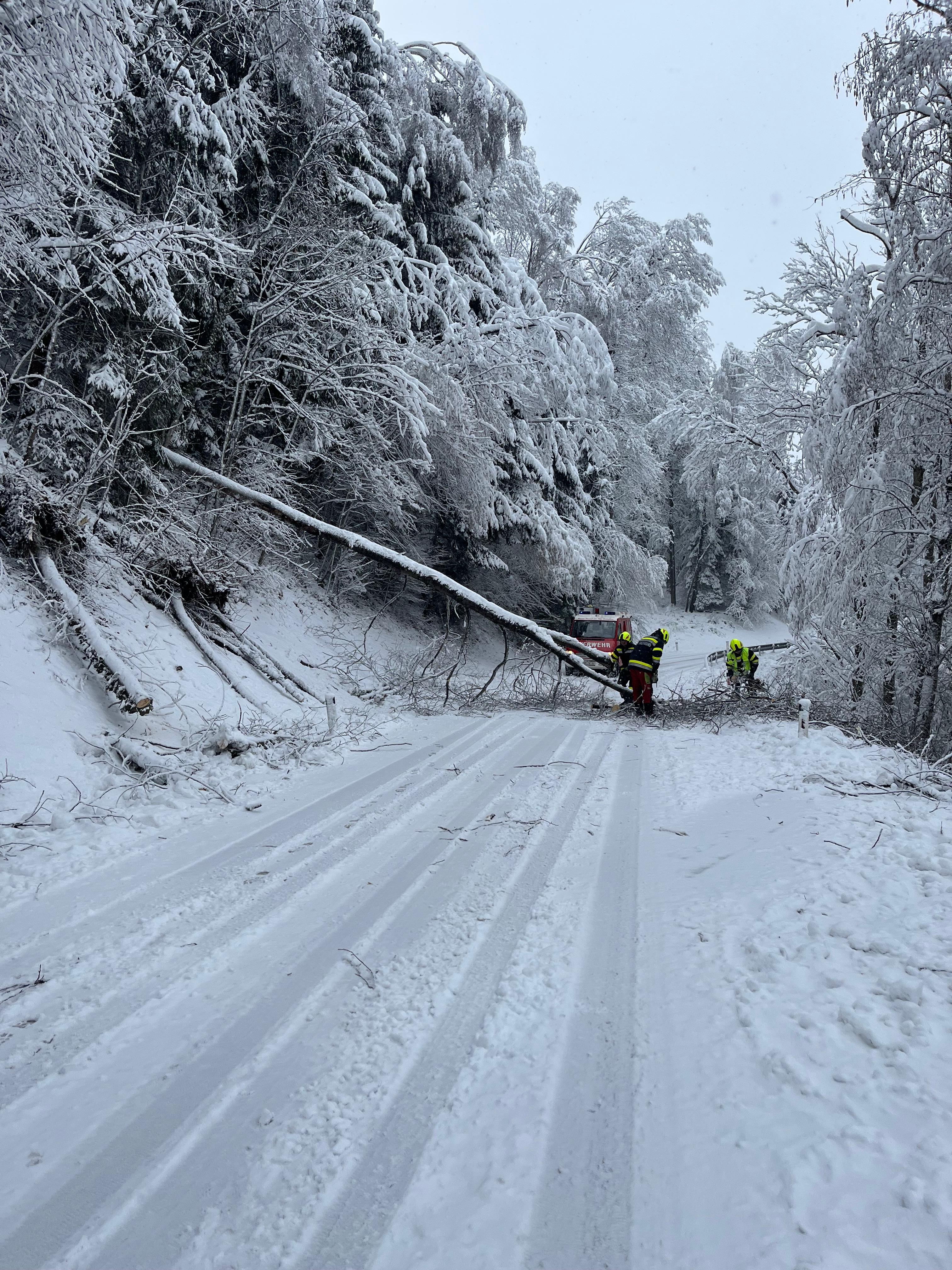 Bei den ersten Einsätzen am Vormittag des Freitag, 20.02.2026 mussten Bäume entfernt werden, die unter der Schneelast gebrochen und über die Straße gefallen waren. Danach mussten Busse und Lkws, die trotz Ketten stecken geblieben waren, abgeschleppt werden. Auch mehrere Pkws, die in den Straßengraben gerutscht waren, wurden wieder auf die Straße gezogen.