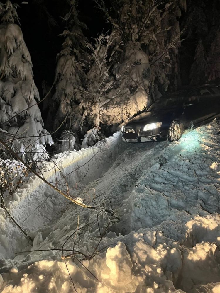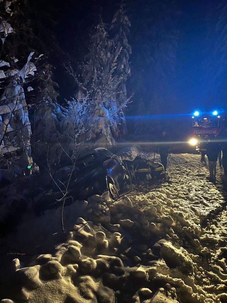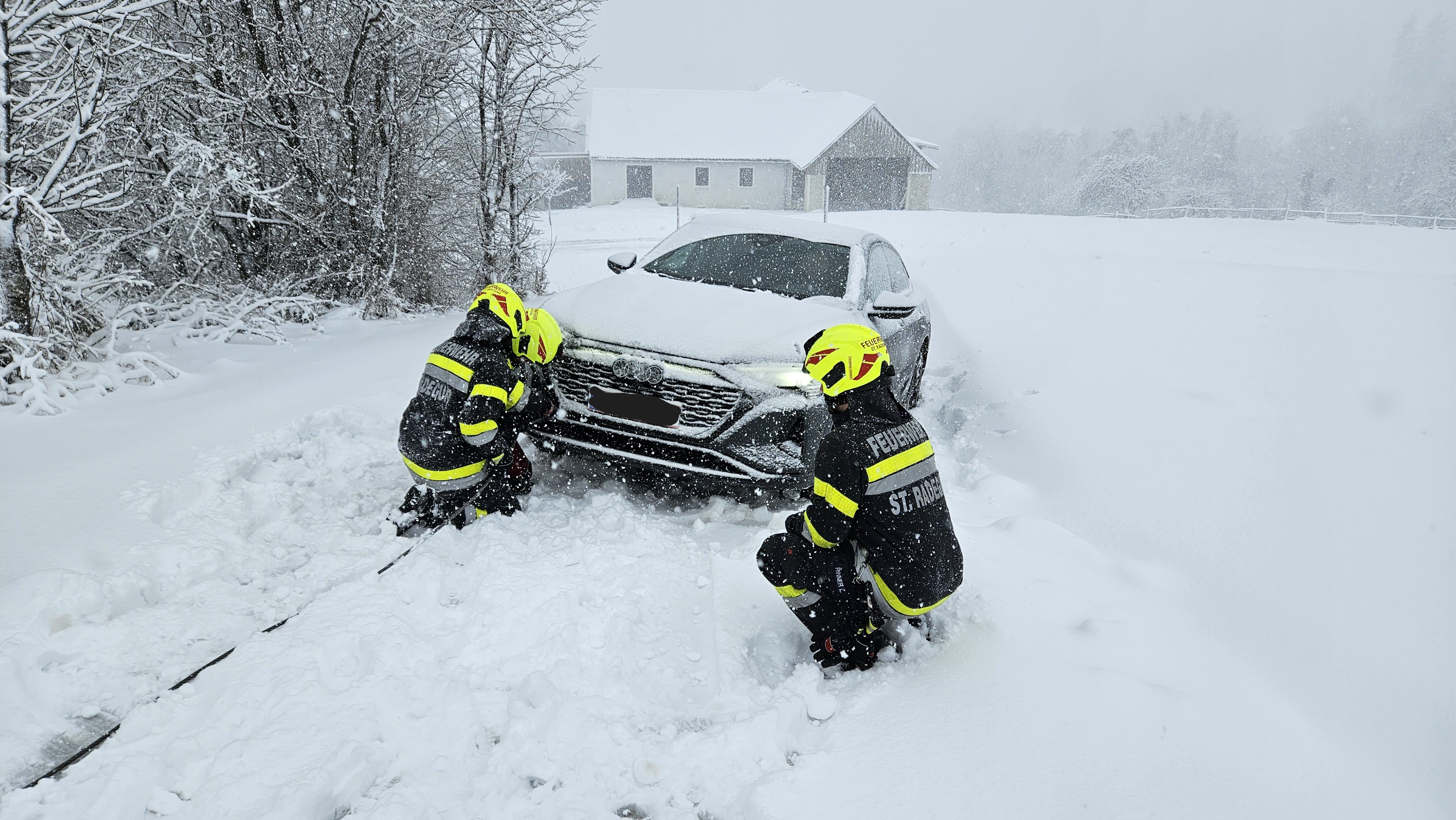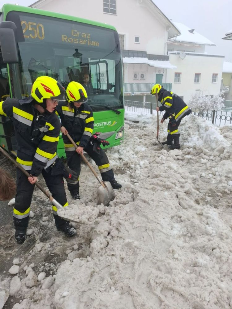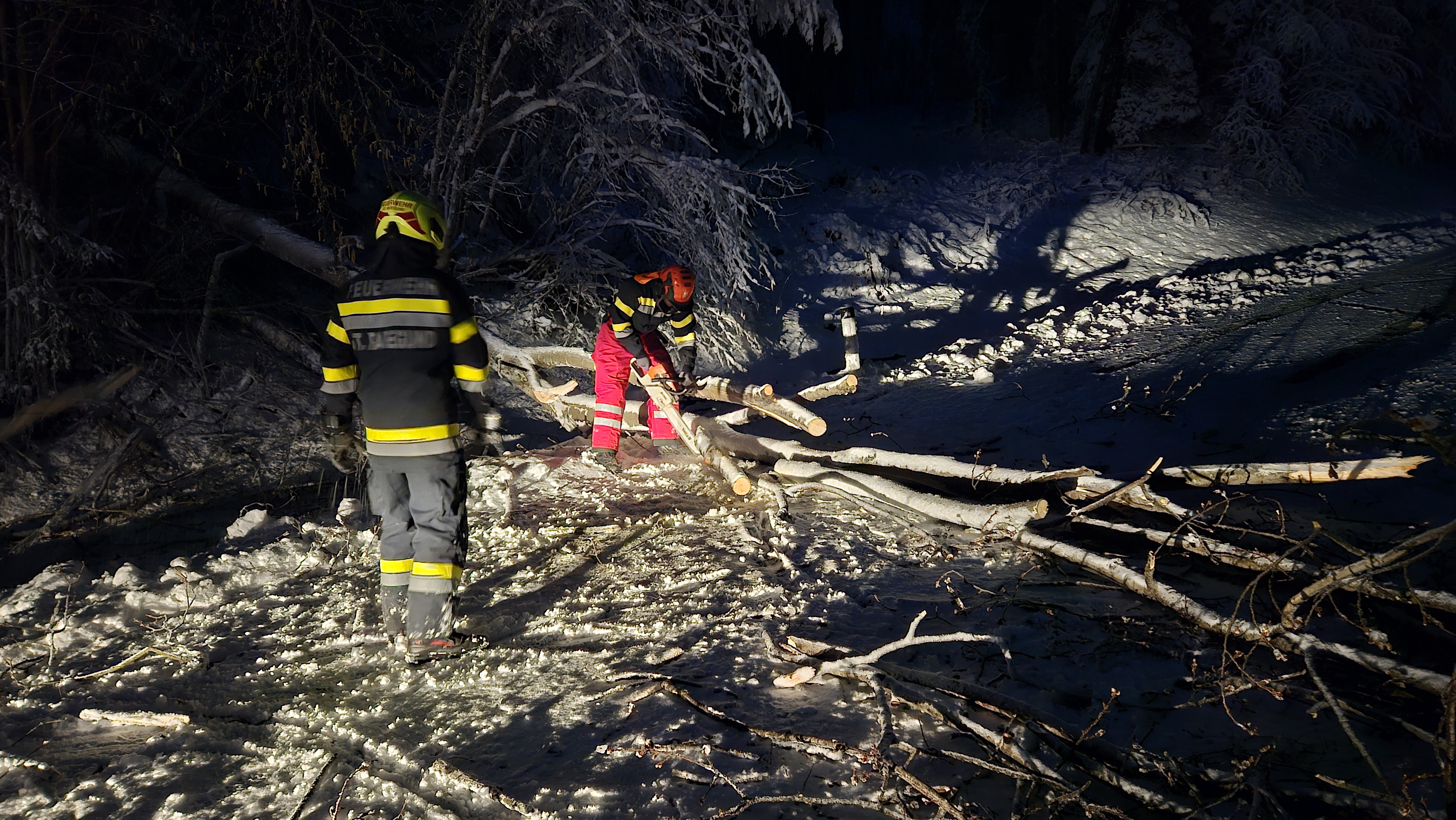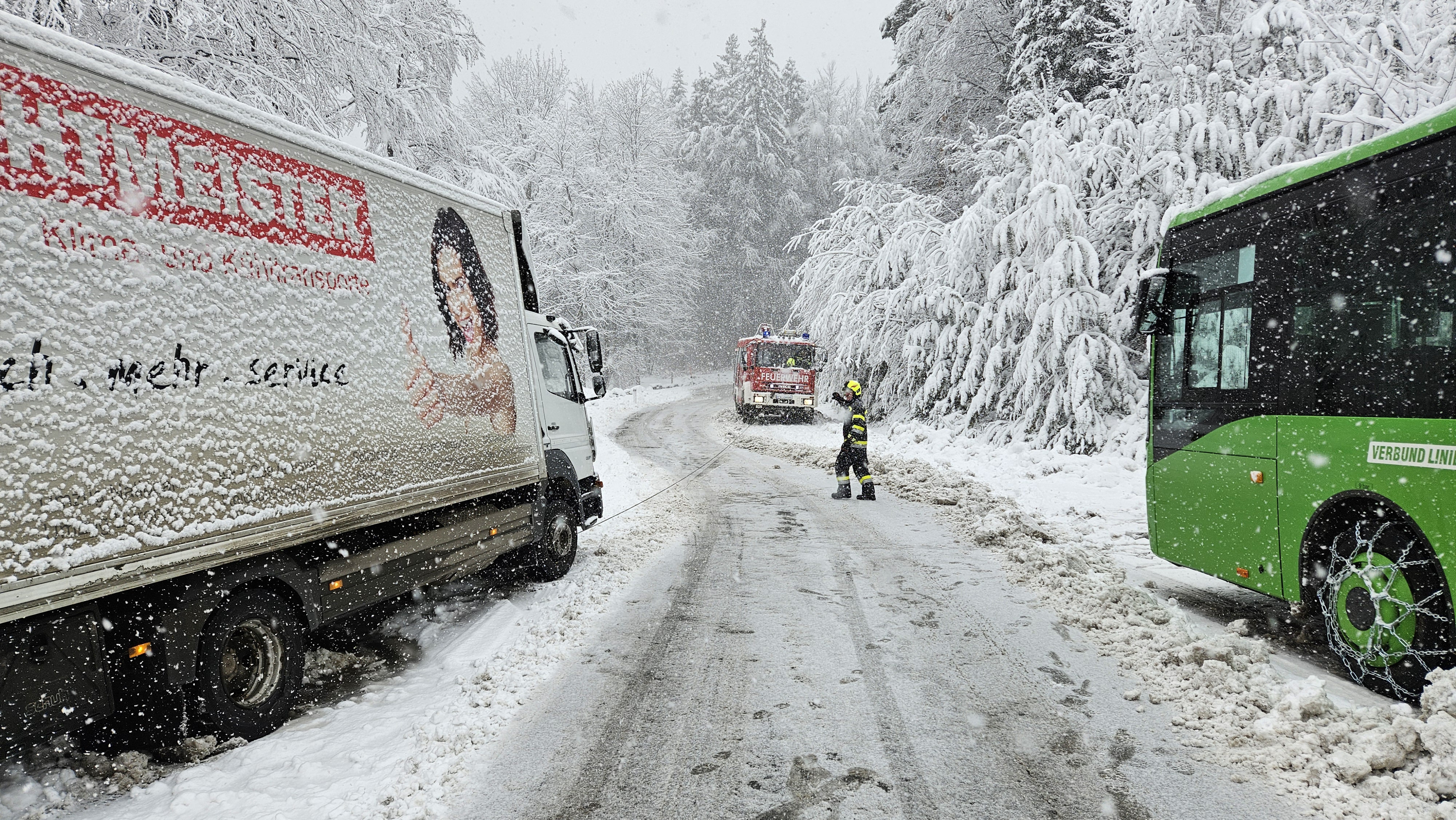 Bei den ersten Einsätzen am Vormittag des Freitag, 20.02.2026 mussten Bäume entfernt werden, die unter der Schneelast gebrochen und über die Straße gefallen waren. Danach mussten Busse und Lkws, die trotz Ketten stecken geblieben waren, abgeschleppt werden. Auch mehrere Pkws, die in den Straßengraben gerutscht waren, wurden wieder auf die Straße gezogen.